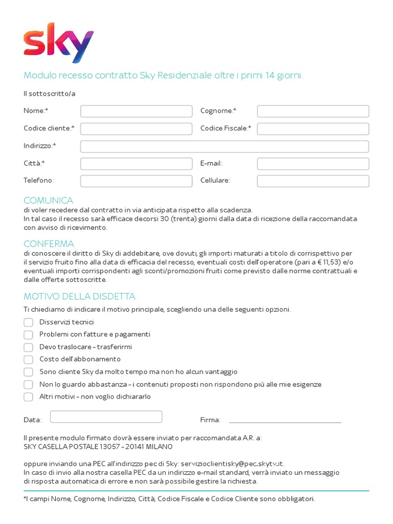 Modulo disdetta Sky PDF | Salvatore Aranzulla Per scaricare il modulo di disdetta Sky in formato PDF, recati su questa pagina del sito di Sky, individua la sezione Recesso entro 14 giorni (in fondo) e clicca sull'icona della freccia rivolta verso il basso, posta in corrispondenza del modulo di tuo interesse, in base al contratto che vuoi disdire (es. Disdetta Sky online: come fare | Libero Pay Ecco come fare la disdetta Sky online in modo semplice e veloce. Come fare disdetta Sky online tramite raccomandata web. Il modulo di disdetta Sky deve essere inviato via Pec o tramite raccomandata con ricevuta di ritorno, affinché vi sia la certezza della data di spedizione e della ricezione da parte del destinatario. Oggi, tuttavia, è ...