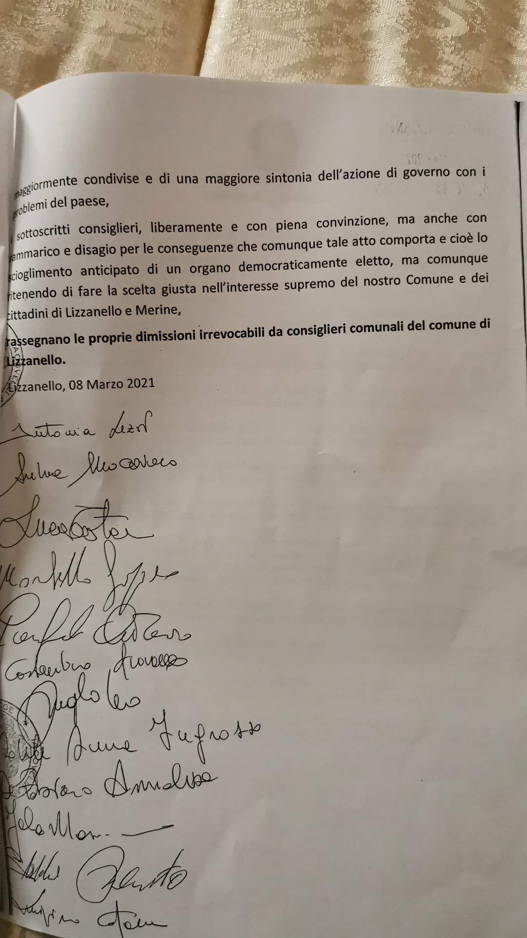 Lettera di dimissioni del Consigliere Comunale di Marsicovetere Gina ... con la presente sono a rassegnarle formalmente le mie irrevocabili dimissioni dalla carica di Consigliere comunale. L'entusiasmo che mi ha portato ad accettare il delicato compito conferitomi, non voglio si perda nell'insoddisfazione,nell'impossibilità di fare e di agire davvero per il bene della comunità di Marsicovetere.