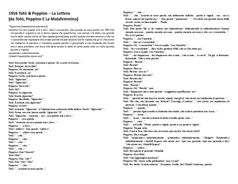 La Lettera (Da Totò, Peppino E La Malafemmina) - Scribd (da Tot, Peppino E La Malafemmina) Signorina (intestazione autonoma) veniamo noi con questa mia a dirvi, adirvi una parola, che scusate se sono poche ma 700 mila lire (punto e virgola) a noi ci fanno specie che quest'anno, una parola, c' stata una grande moria delle vacche come voi ben sapete (punto) (due punti): questa moneta servono a che voi La lettera in Totò, Peppino e la Malafemmina | Learn Italian Daily Anno: 1956. Durata: 105 minuti. Genere: commedia. Regia: Camillo Mastrocinque. Interpreti principali: Totò, Peppino de Filippo. Totò e Peppino - Lettera. Watch on. (se non capite qualcosa, in fondo alla pagina c'è la trascrizione del video, e alcune spiegazioni) Totò Peppino e la…Malafemmina è una delle commedie più conosciute del ... melita nobile: LA LETTERA DI TOTO' E PEPPINO ALLA MALAFEMMINA - Blogger LA LETTERA DI TOTO' E PEPPINO ALLA MALAFEMMINA Totò, Peppino e la malafemmena Pubblicato da melita a 12:19 Nessun commento: Posta un commento Per lasciare un commento, fai clic sul pulsante di seguito per accedere con Google. Accedi con Google Totò e Peppino - Lettera - YouTube Il celeberrimo dettato di Totò a Peppino, dal film "Totò Peppino e la Malafemmena"
